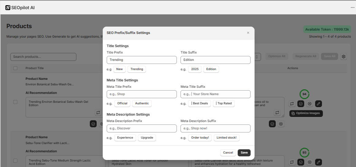 Add default prefixes or suffixes for Product Titles, Meta Titles, or Descriptions